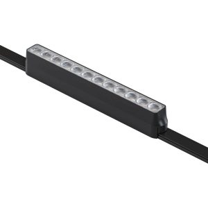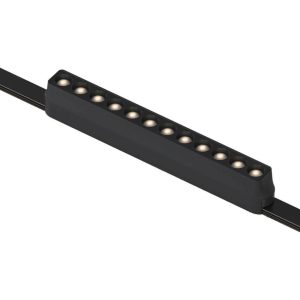 Μαγνητικό φωτιστικό για ράγα σε μαύρο χρώμα, με διαστάσεις 23 cm μήκος, 2,6 cm πλάτος και 3,6 cm ύψος. Διαθέτει ενσωματωμένο LED 12W και χρώμα φωτισμού λευκό ημέρας 4000K.