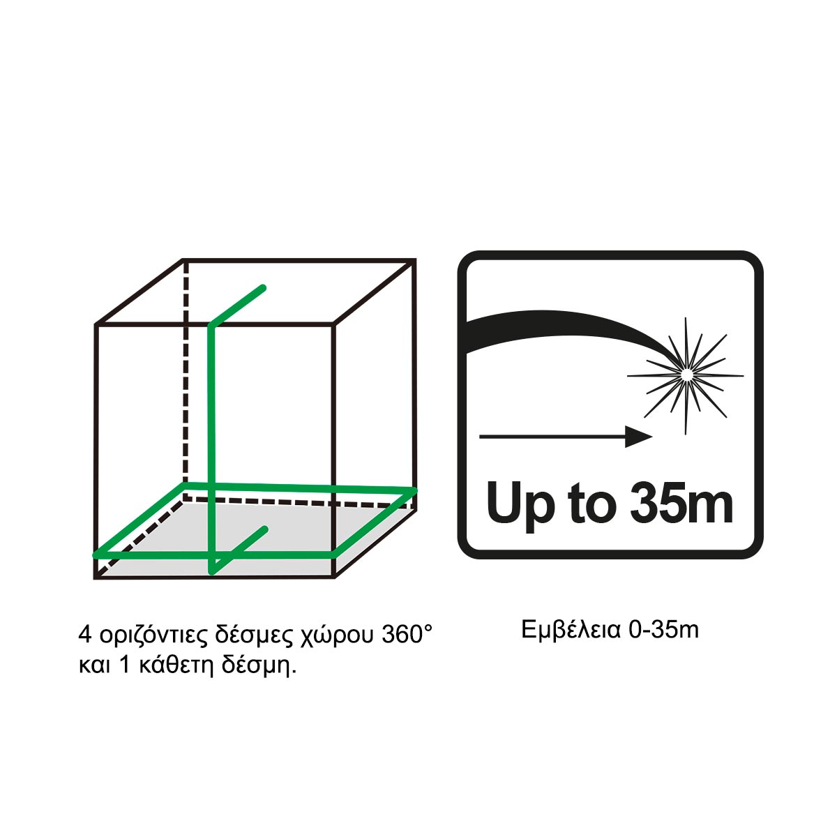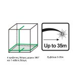 Εύρος Μέτρησης: 0-35m Ακρίβεια Μέτρησης: ± 0.2mm/m (± 1.5 mm/7m) Μαγνητικό: Ναι Επίπεδο Προστασίας: IP54 Λεπτομέρειες προϊόντος: Λειτουργίες : 4 οριζόντιες δέσμες χώρου 360° και 1 κάθετη δέσμη. Εμβέλεια 0-35m. Χρόνος μέτρησης < 3sec. Εύρος αυτοχωροστάθμησης ≤4°. Ακρίβεια χωροστάθμησης ± 1.5 mm/7m. Πράσινο Laser 520±10nm, <1mW, class ΙΙ. Αυτόματη απενεργοποίηση. Ισχυρός μαγνήτης στην πίσω πλευρά. Υποδοχή για ανάρτηση σε τοίχο. Σύνδεση με τρίποδο 1/4", κυλινδρική βίδα. Θερμοκρασία λειτουργίας: 0~+40℃. Θερμοκρασία αποθήκευσης: -10~+50℃. Laser με δέσμη εδάφους ελάχιστου ύψους 10mm σε απευθείας τοποθέτηση στο έδαφος. Ιδανική για τοίχο και για τοποθέτηση πλακακιών. Περιεχόμενα συσκευασίας: 2 τεμ. Επαναφορτιζόμενες Μπαταρίες Li-Ion 2600mΑh. 1 τεμ. Καλώδιο USB Type-C 1 τεμ. Τηλεχειριστήριο. 1 τεμ. Μαγνητική βάση. Υφασμάτινη θήκη. INDUSTRIAL (Επαγγελματικός - Βιομηχανικός): Ναι