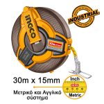 Υλικό: Εξωτερικό: ABS με κάλυμα από καουτσούκ, Εσωτερικό: Fiberglass Μέγεθος: Μετροταινίας: 30m x 15mm Σύστημα Μέτρησης: Μετρικό και Αγγλικό Λεπτομέρειες προϊόντος: Αδιάβροχη, Αναλογία 3:1 γραναζιών για γρήγορο μάζεμα ταινίας, Ενσωματωμένη λαβή. INDUSTRIAL (Επαγγελματικός - Βιομηχανικός): Ναι