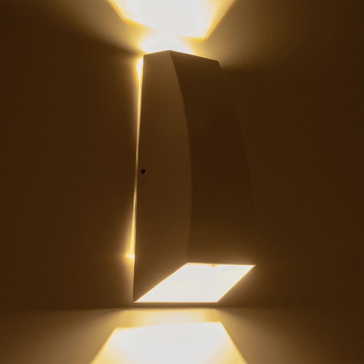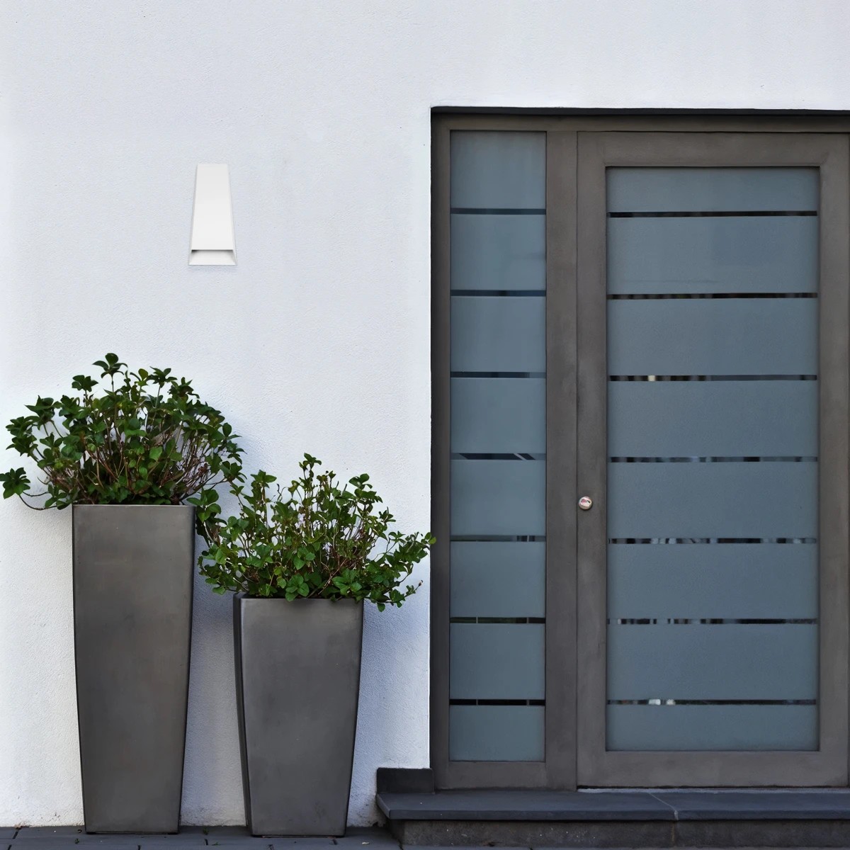 Φωτιστικό τοίχου – απλίκα της σειράς FLUX σε απόχρωση λευκή, από αλουμίνιο με ενσωματωμένο Led 6 Watt και χρώμα φωτισμού θερμό λευκό (2700K). Έχει δείκτη προστασίας IP65, καθιστώντας το ανθεκτικό σε σκόνη και νερό, ιδανικό για εξωτερικές τοποθεσίες.