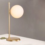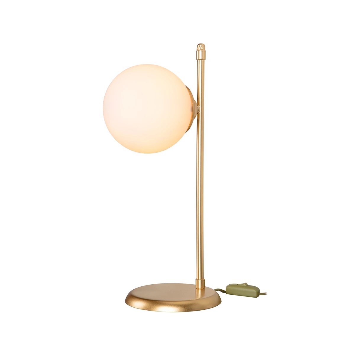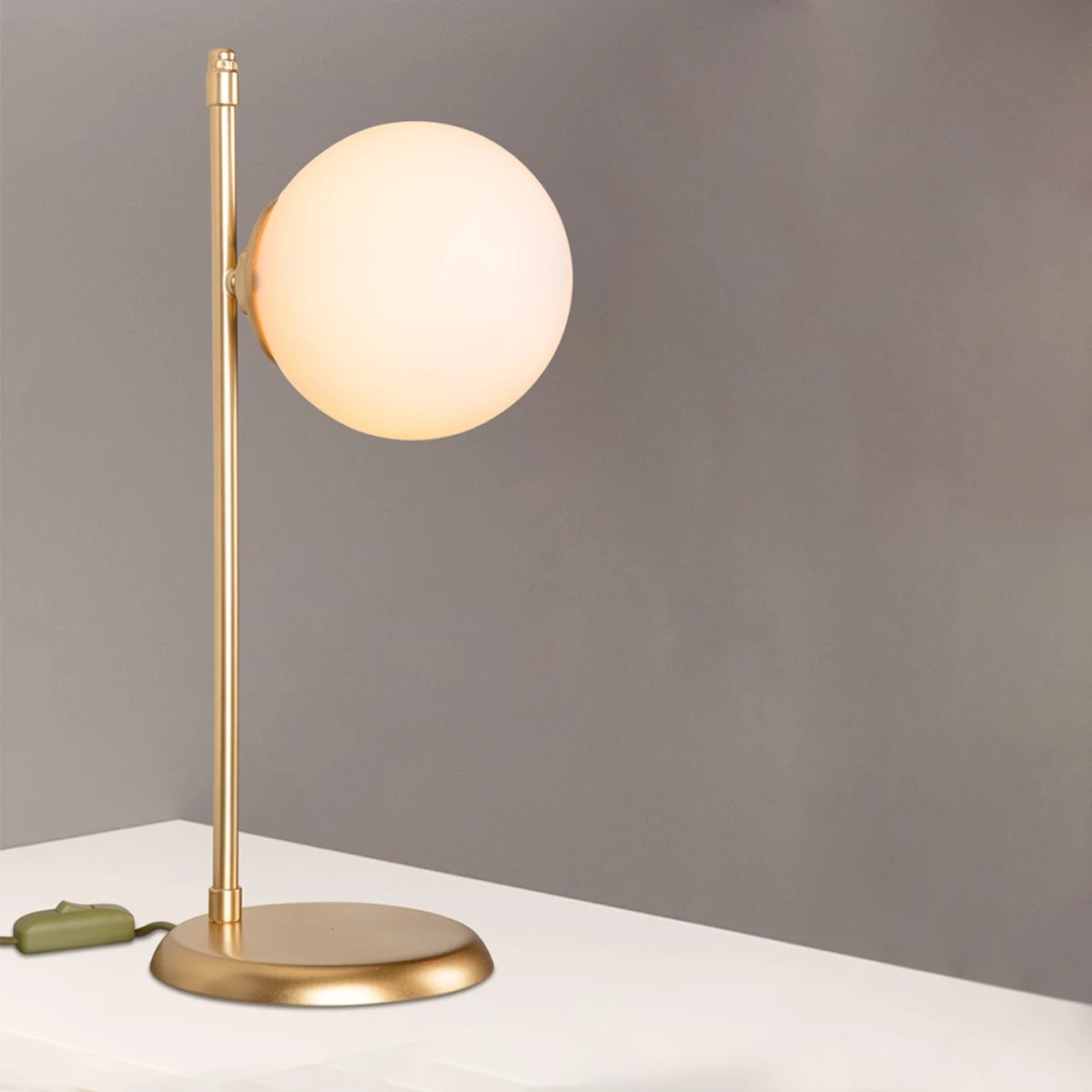 Επιτραπέζιο φωτιστικό πορτατίφ GLOBUS σε απόχρωση χρυσή, μεταλλικό με λευκό γυάλινο καπέλο. Διαθέτει υποδοχή για λαμπτήρα τύπου E27. Ένα μοντέρνο φωτιστικό κατάλληλο για τοποθέτηση σε υπνοδωμάτιο , γραφείο και σαλόνι.