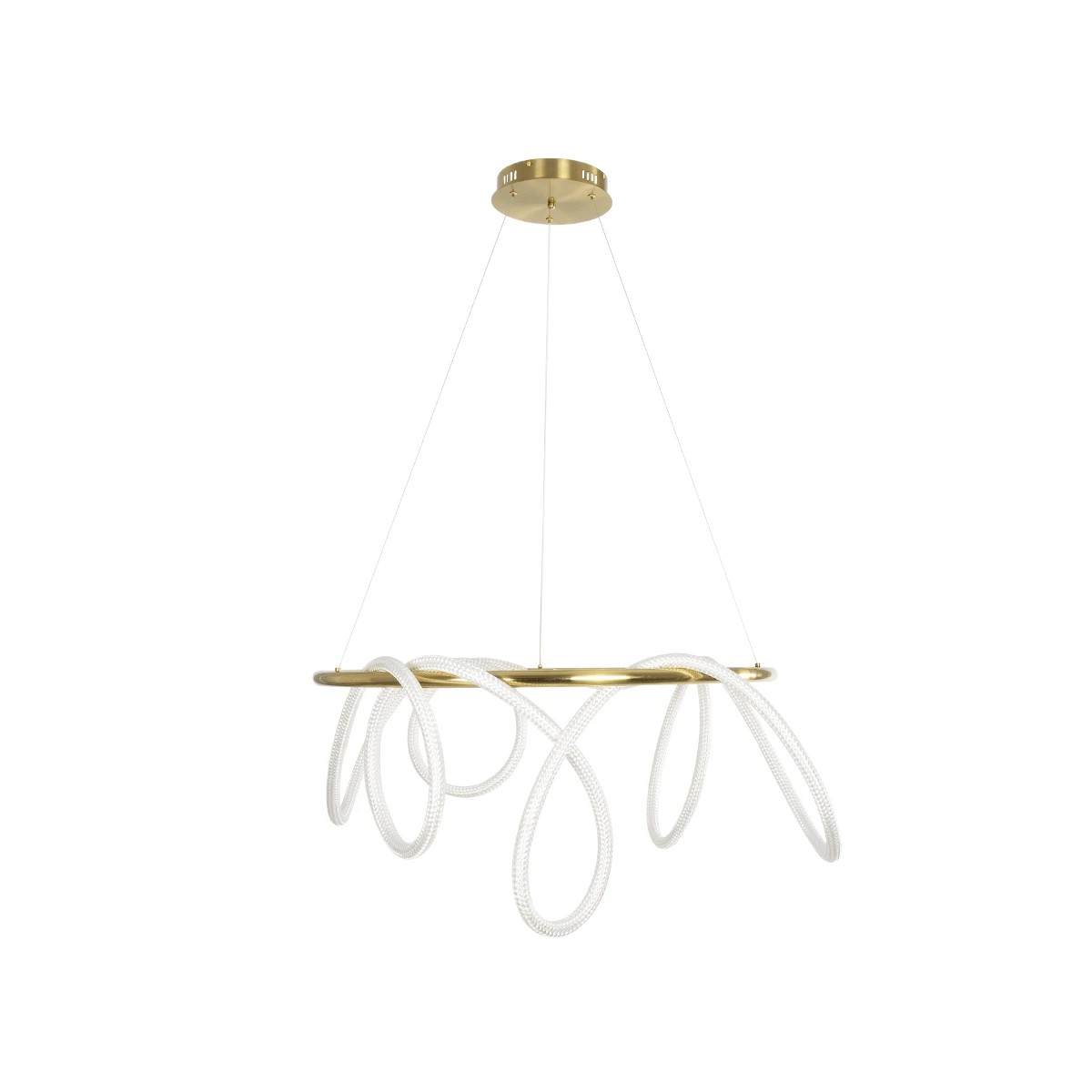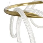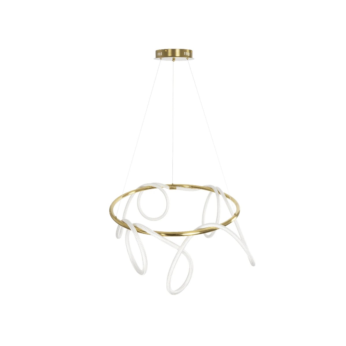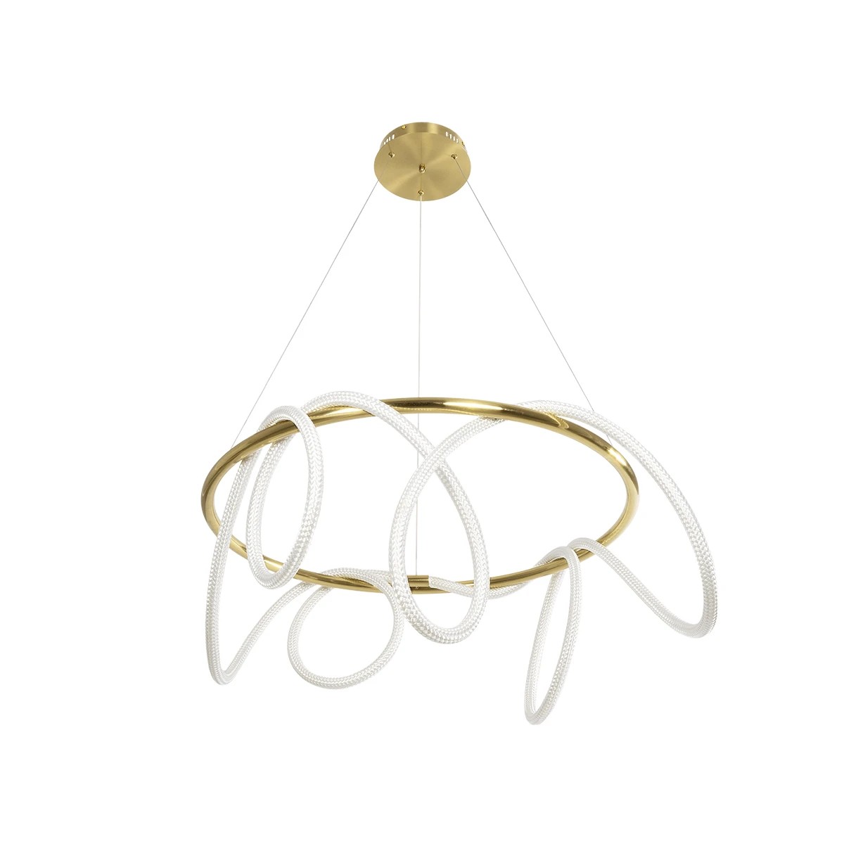 Το κρεμαστό φωτιστικό της σειράς GLOW ξεχωρίζει με τον μοντέρνο σχεδιασμό του σε χρυσό και λευκό χρώμα. Είναι κατασκευασμένο από αλουμίνιο και σχοινί, διαθέτει ενσωματωμένο LED 69W με φωτεινή ροή 6900lm και ρυθμιζόμενο λευκό φως (CCT). Με χειριστήριο για εναλλαγή χρωμάτων και ρύθμιση έντασης, προσφέρει άνεση και ευελιξία στον φωτισμό. Έχει γωνία δέσμης 360°, διάρκεια ζωής πάνω από 30.000 ώρες και ταιριάζει ιδανικά σε κάθε σύγχρονο εσωτερικό χώρο.