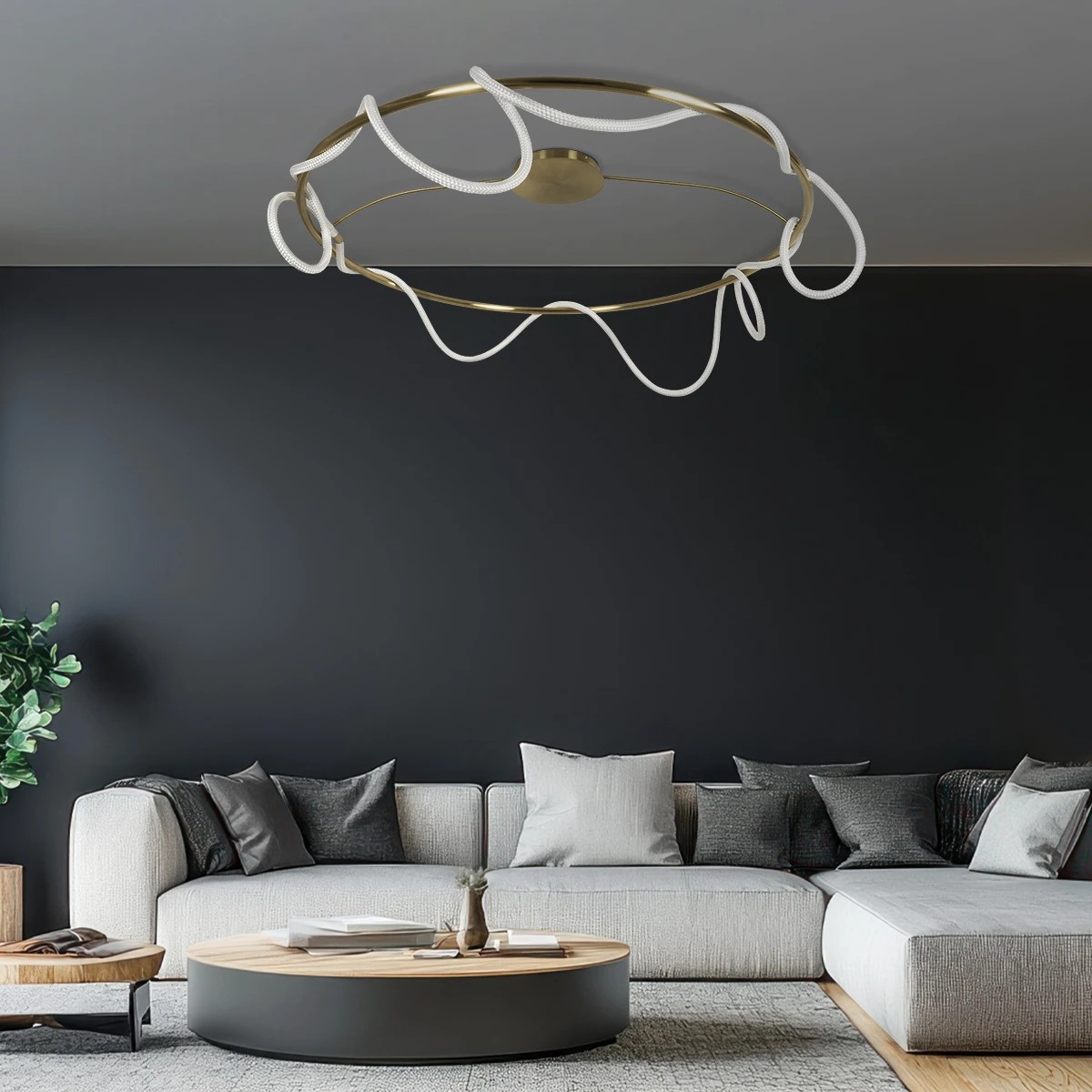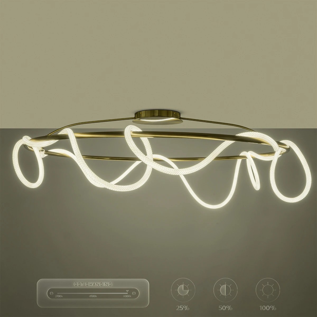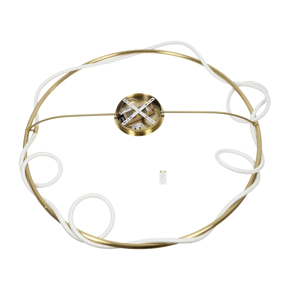 Το φωτιστικό οροφής της σειράς GLOW ξεχωρίζει με τον μοντέρνο σχεδιασμό του σε χρυσό και λευκό χρώμα. Είναι κατασκευασμένο από αλουμίνιο και σχοινί, διαθέτει ενσωματωμένο LED 89W με φωτεινή ροή 8900lm και ρυθμιζόμενο λευκό φως (CCT). Με χειριστήριο για εναλλαγή χρωμάτων και ρύθμιση έντασης, προσφέρει άνεση και ευελιξία στον φωτισμό. Έχει γωνία δέσμης 360°, διάρκεια ζωής πάνω από 30.000 ώρες και ταιριάζει ιδανικά σε κάθε σύγχρονο εσωτερικό χώρο.